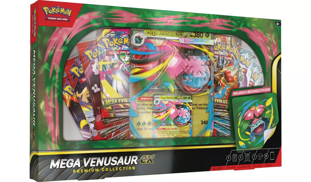 Solar-Powered Smackdowns with Mega Venusaur ex! Keep your Pokemon at full power with help from Mega Venusaur ex! Its Solar Transfer Ability lets you move Grass Energy among your Pokemon as you please, ensuring you're always ready to attack. In this collection, you get a playable foil promo card and an oversize lenticular promo card featuring Mega Venusaur ex, along with a tech sticker for decorating devices, binders, and notebooks. You'll find even more Pokemon inside a stack of Pokemon TCG booster packs.